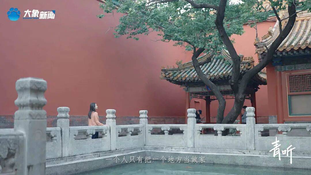 我身后是杨老师70年前亲手栽下的一棵红杏,一个人只有把一个地方当做家才会自然而然地想要种下一棵树。如今红杏已参天,这是多么具象化的一个时间刻度,他和故宫的一草一木共生长,把自己活成了故宫的一部分。